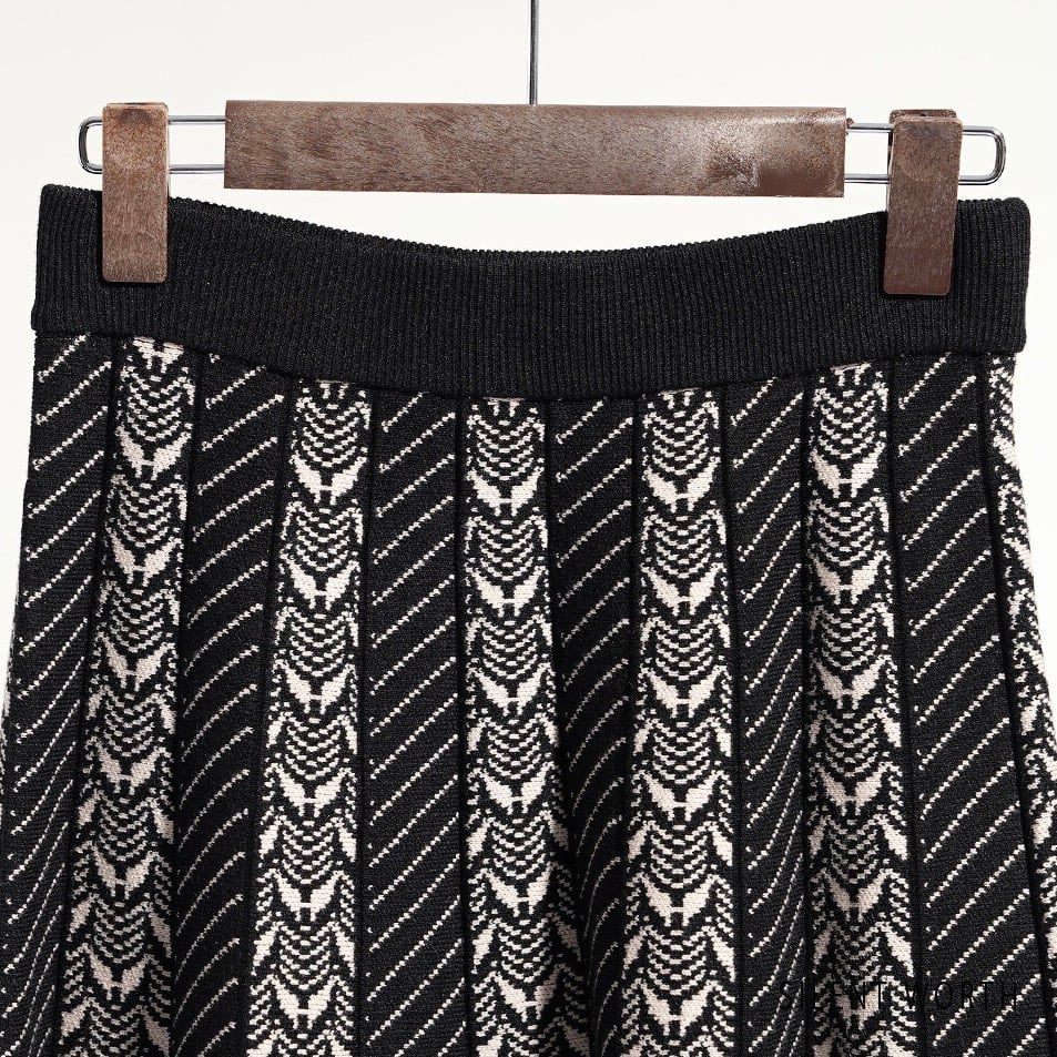 バイカラーの柄を組み合わせ、縦切り替えラインで編み上げた、まるでプリーツスカートのような立体感が魅力の総柄ニットフレアスカートです☆