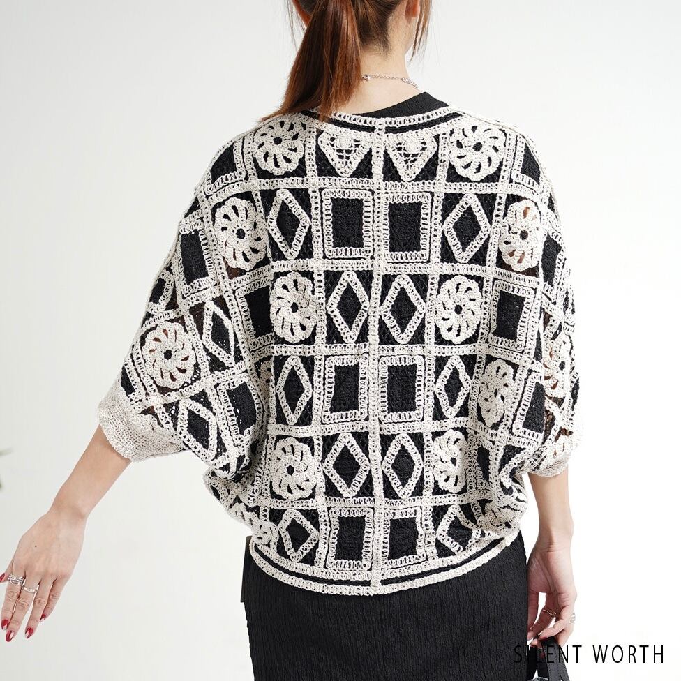 繊細な幾何柄をバイカラーで編み上げた、存在感のある刺繍レースカーデです☆