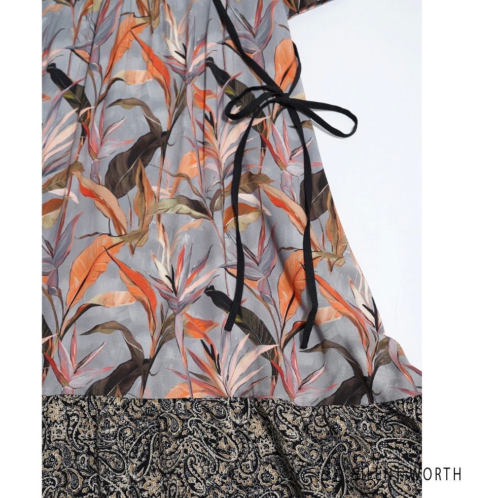 2種類のプリント柄を組み合わせた華やかなデザインが目を引く、リーフ柄パッチワークワンピースです☆
